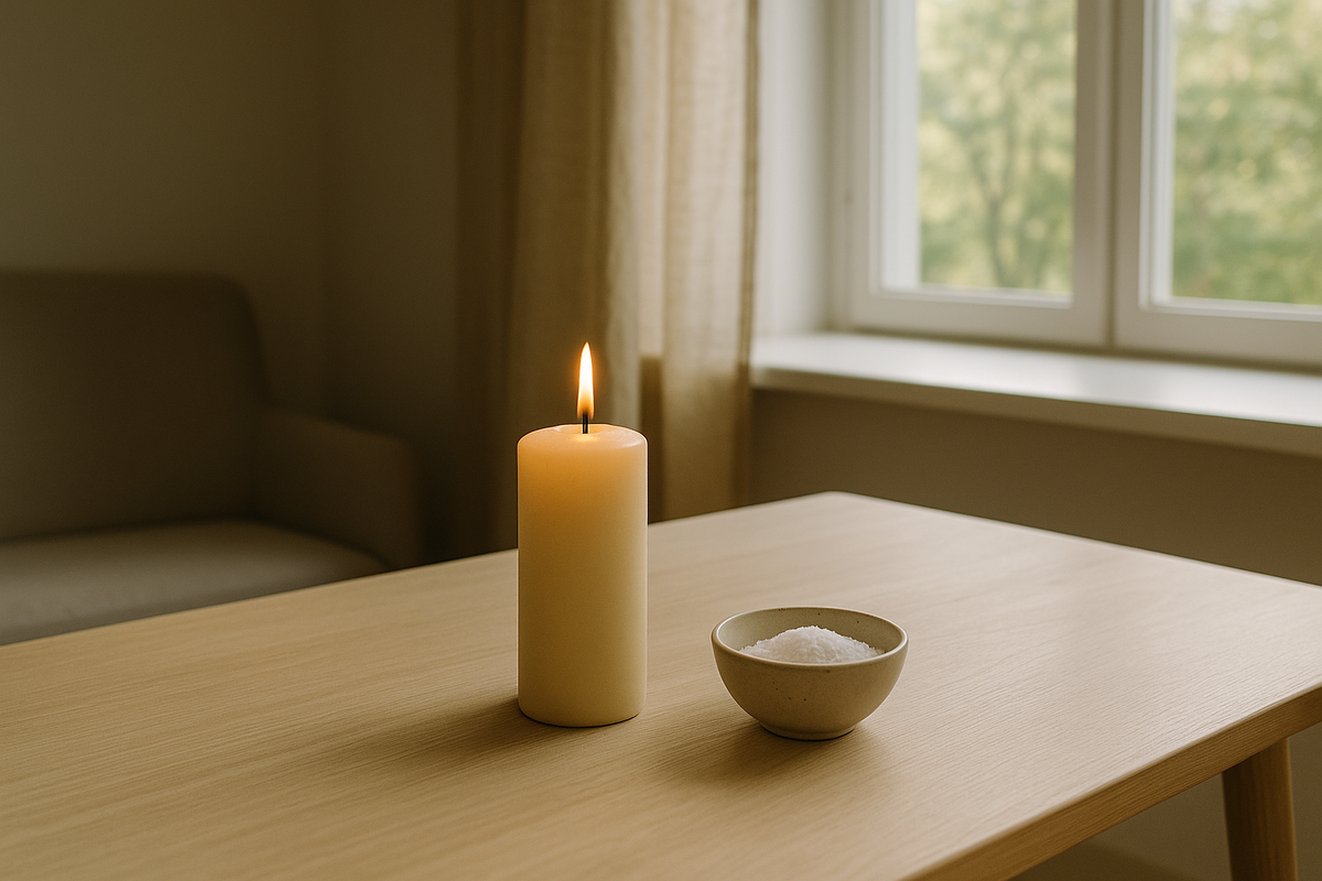 Также зажгите свечу — огонь помогает стабилизировать энергию и мягко завершает процесс. Несколько минут спокойного наблюдения за пламенем дают телу сигнал, что работа завершена.