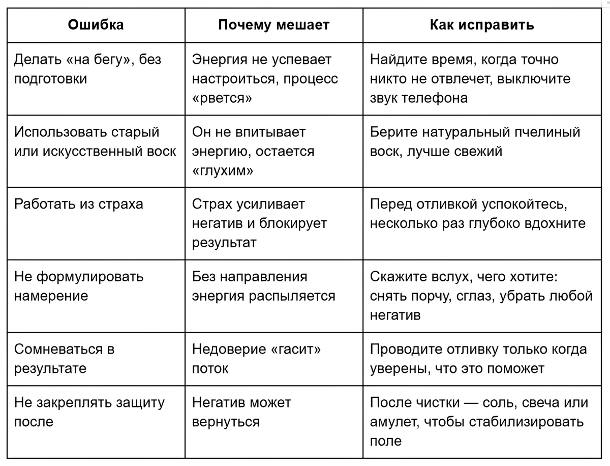 Если воздействие слабое и появилось недавно, обычно хватает одной отливки — она снимает поверхностный сглаз и возвращает внутренний баланс.